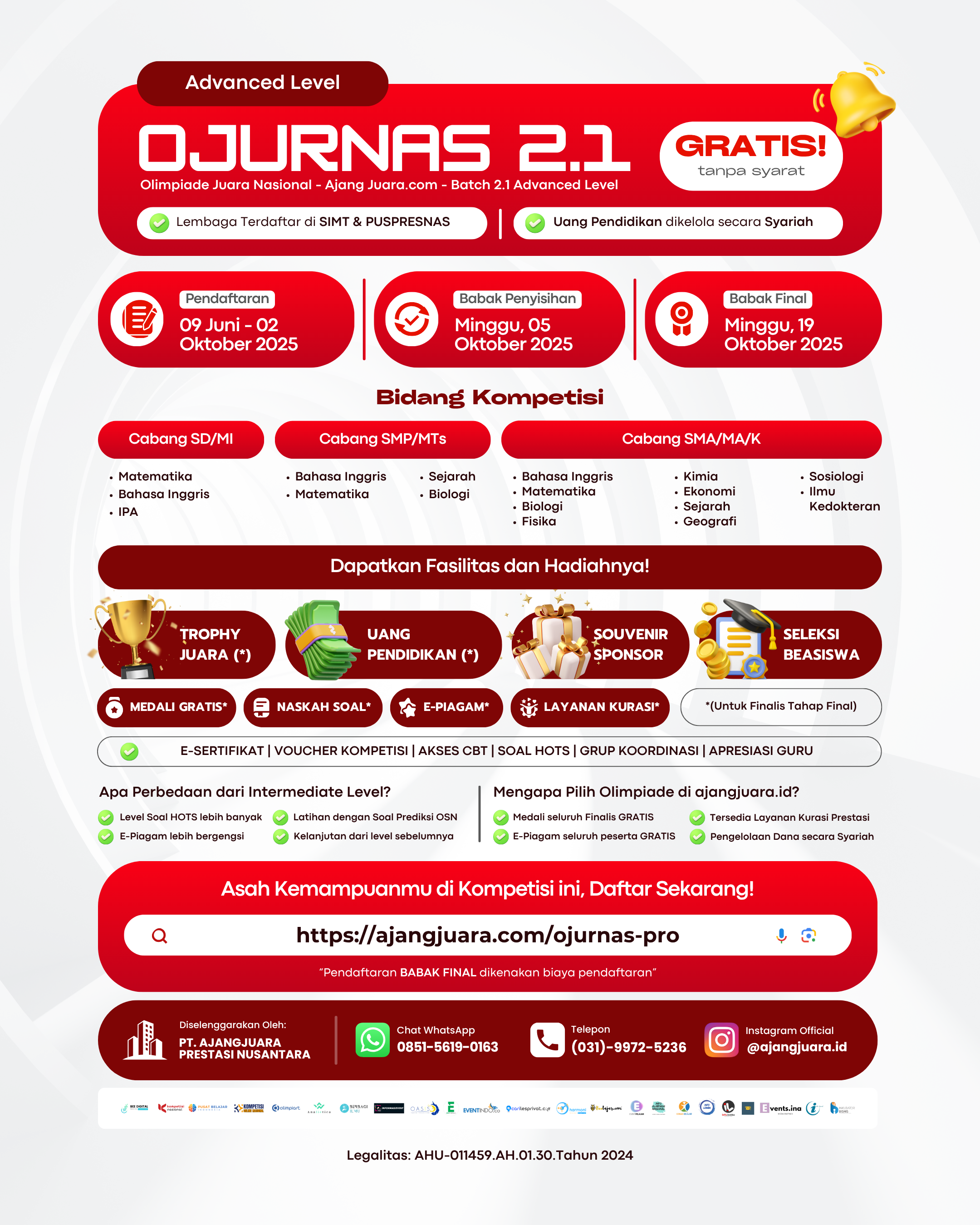 OJURNAS 2.1 (Olimpiade Juara Nasional) hadir sebagai kompetisi resmi & terpercaya, diselenggarakan oleh PT. Ajangjuara Prestasi Nusantara, dan telah terdaftar di SIMT Kurasi Puspresnas.
