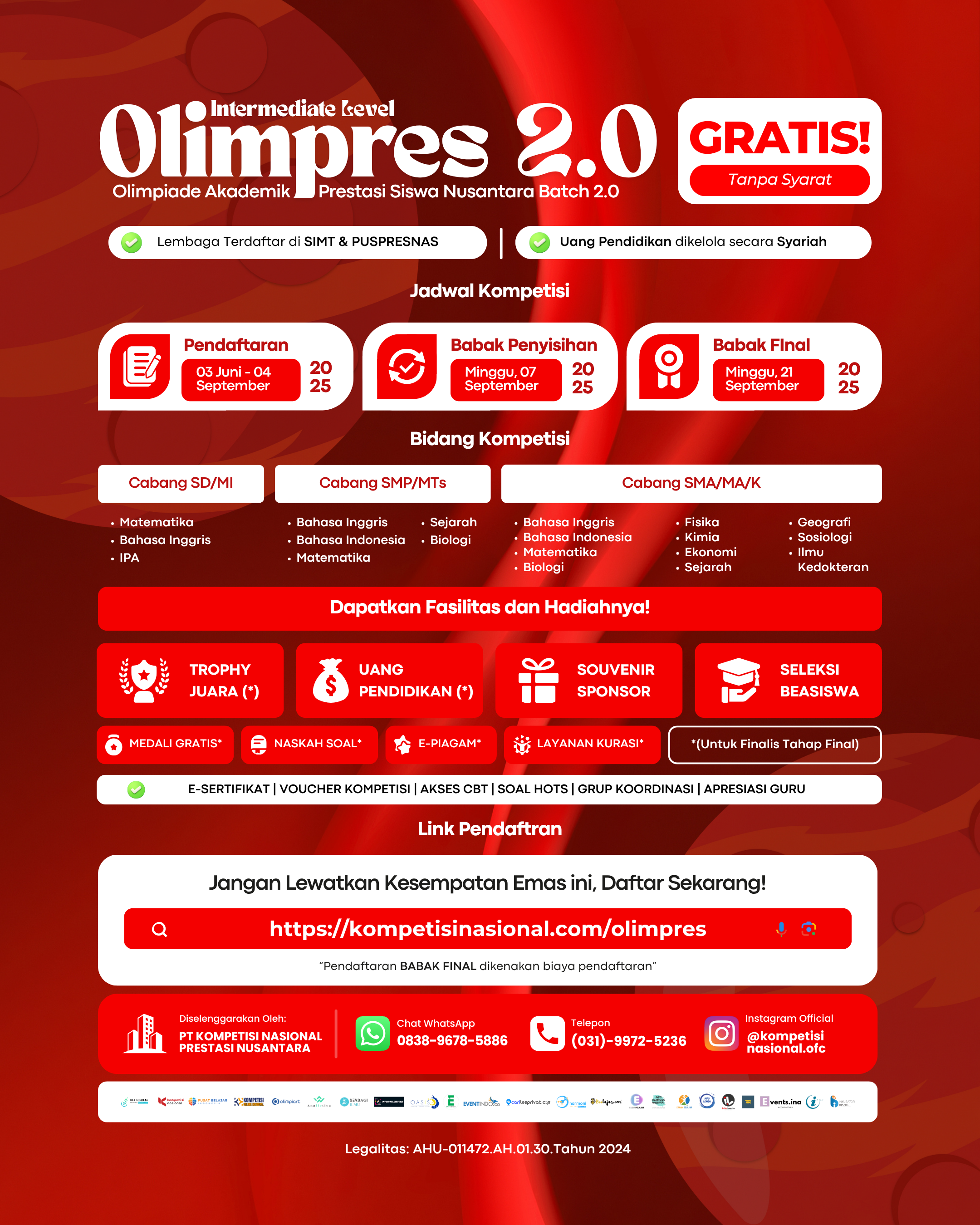 OLIMPRES 2.0 (Olimpiade Nasional Prestasi Nusantara) hadir sebagai kompetisi akademik resmi & gratis yang tidak hanya menantang, tapi juga bernilai tinggi untuk masa depanmu.